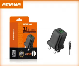 Amaya AD036 3.1A Dual USB Fast Charger ā Smart Charging Universal Wall Adapter (2 Ports, 1-Year Warranty)